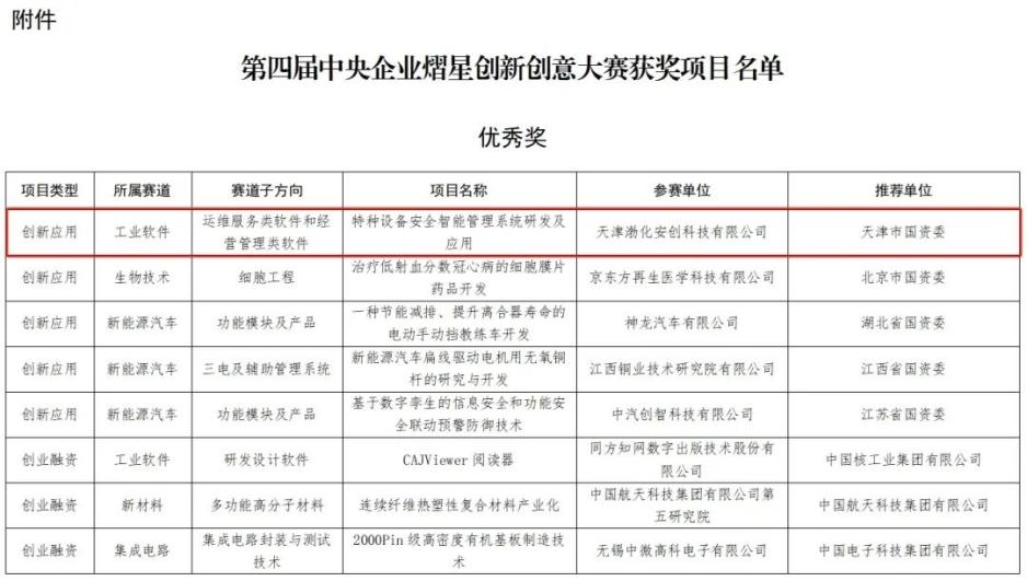 日前,國務(wù)院國資委辦公廳正式發(fā)布《關(guān)于第四屆中央企業(yè)熠星創(chuàng)新創(chuàng)意大賽獲獎(jiǎng)名單的通報(bào)》,渤化集團(tuán)所屬天津渤化安創(chuàng)科技有限公司(簡稱“渤化安創(chuàng)”)申報(bào)的“特種設(shè)備安全智能管理系統(tǒng)研發(fā)及應(yīng)用”項(xiàng)目,歷經(jīng)一年的征集、初選、復(fù)選、導(dǎo)師輔導(dǎo)、對接路演等多項(xiàng)賽程,榮獲第四屆中央企業(yè)熠星創(chuàng)新創(chuàng)意大賽優(yōu)秀獎(jiǎng)。