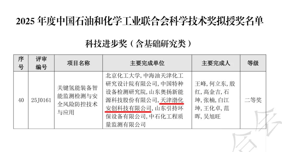 日前,中國石油和化學(xué)工業(yè)聯(lián)合會發(fā)布《2025年度中國石油和化學(xué)工業(yè)聯(lián)合會科學(xué)技術(shù)獎擬授獎名單公示》,渤化集團所屬天津渤化安創(chuàng)科技有限公司(簡稱“渤化安創(chuàng)”)參與完成的“關(guān)鍵氫能裝備智能監(jiān)測檢測與安全風(fēng)險防控技術(shù)及應(yīng)用”項目,憑借在氫能安全領(lǐng)域取得的突破性成果,成功斬獲中國石油和化學(xué)工業(yè)聯(lián)合會科技進步二等獎。