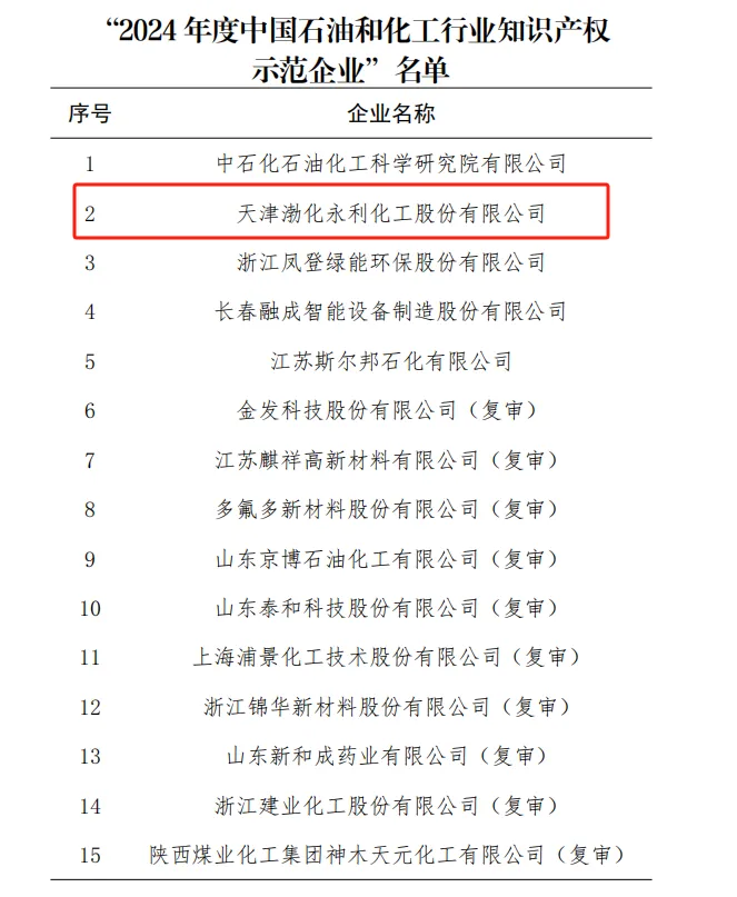 日前,中國石油和化學(xué)工業(yè)聯(lián)合會(huì)正式公布了《關(guān)于認(rèn)定2024年度中國石油和化工行業(yè)知識(shí)產(chǎn)權(quán)示范企業(yè)的決定》,天津渤化永利化工股份有限公司成功入選,成為2024年度全國15家獲此殊榮的企業(yè)之一。