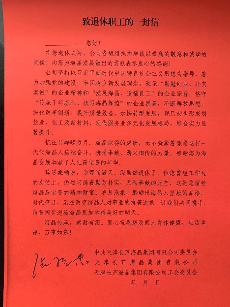 按照集團公司工會《關(guān)于開展職工退休前“四個一”暖人心工作的通知》(津渤化工發(fā)〔2021〕30號)文件要求,海晶公司工會用小載體體現(xiàn)大情懷、真感情,用心用情做好職工退休前“四個一”暖人心服務工作,通過“舉辦一個小儀式”“遞上一封感謝信”“贈送一份紀念品”“送上一張服務卡”活動,突出退休儀式感,提升職工幸福感。